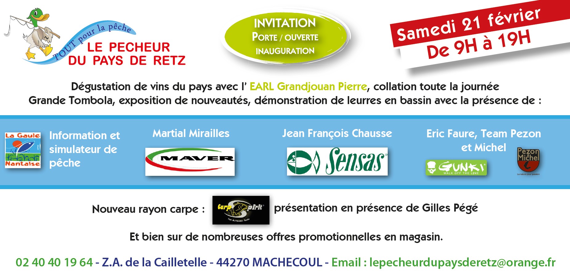 | Bonjour amis pêcheurs, 2015 montre un tournant pour votre espace pêche, en effet, vous retrouverez à la même adresse votre nouveau magasin d'une superficie de 300 m². Afin de vous faire découvrir ce nouvel espace, je vous convie le samedi 21 février de 9h à 19h00 pour les portes-ouvertes qui correspondent donc cette année à l'inauguration. Souhaitant vous accueillir nombreux, à bientôt... Cordialement Yohann RONDINEAU SARL LE PECHEUR DU PAYS DE RETZ ZA LA CAILLETELLE 44270 MACHECOUL 02.40.40.19.64 https://upload.alloforum.com/23949/4YU0YJ8F